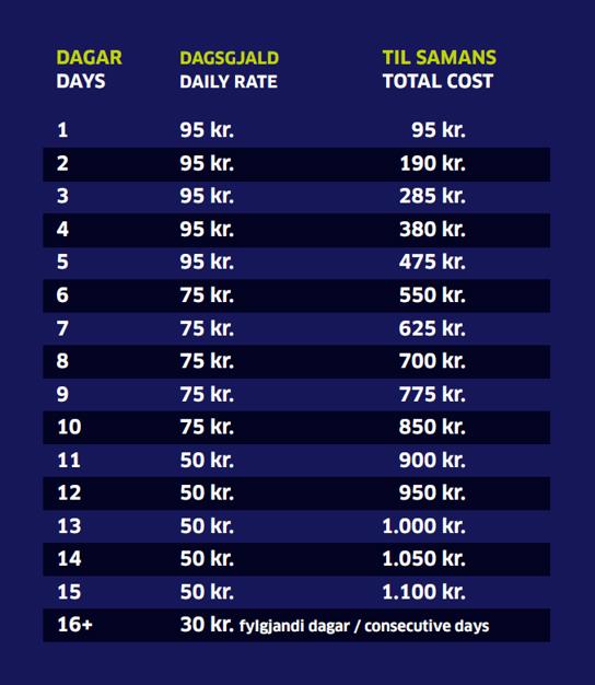 Parkering styttri enn 2 tímar er ókeypis. Síðani rindar tú sambært galdandi prísyvirliti niðanfyri.