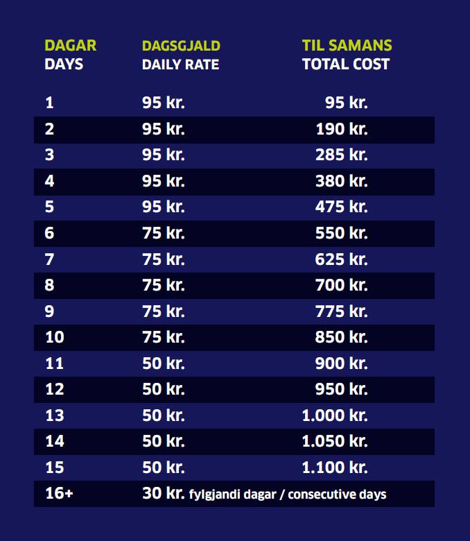 Sum dømi um prísbroytingina kunnu nevnast, at hevur tú parkerað í 3 dagar, hækkar gjaldið við kr. 45 - úr kr. 240 í kr. 285, og hevur tú parkerað í 8 dagar, hækkar gjaldið við kr. 180 - úr kr. 520 í kr. 700.