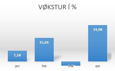 Vøksturin í apríl var serstakliga høgur, við einum vøkstri á 24,1%. Mars var hinvegin metlágur, við einum halli á 2,7%. Páskirnar í 2018 lógu partvís í mars, ið ávirka tølini fyri mars og apríl.